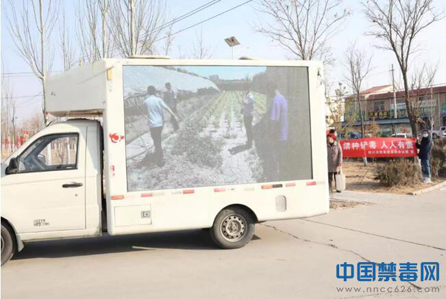 图为多媒体禁毒宣传流动车播放着禁种铲毒相关知识。中国禁毒网发