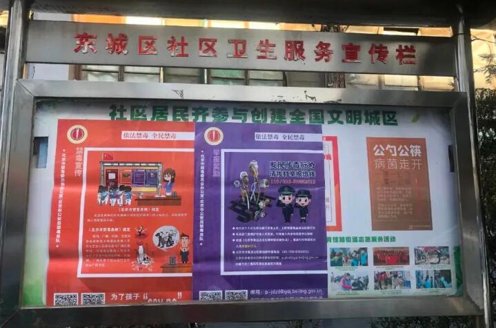 为全面扩大禁毒宣传的覆盖面,东花市街道在和谐园公园以及人流较多的路口张贴《北京市禁毒条例》宣传海报,便于附近居民自觉学习毒品的种类与特征、新型毒品的伪装性与危害学习禁毒知识,了解防毒拒毒的方法,掌握举报涉毒违法犯罪行为的方式,营造了浓厚的全民依法禁毒氛围。