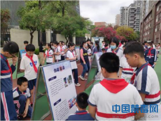 图为学生观看禁毒宣传展板。中国禁毒网发