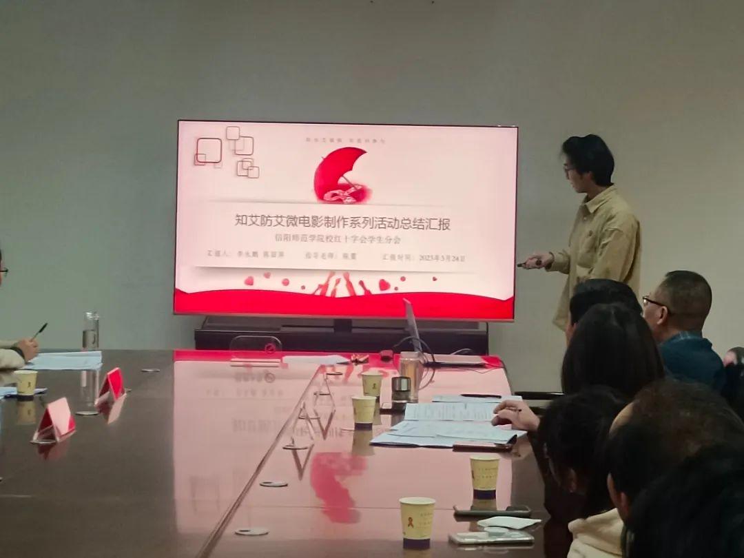 信阳师范学院2021级传媒学院李永鹏同学代表信阳师范学院红十字会学生分会做"知艾防艾微电影制作系列活动"项目汇报,获得了专家组和兄弟院校的一致好评。