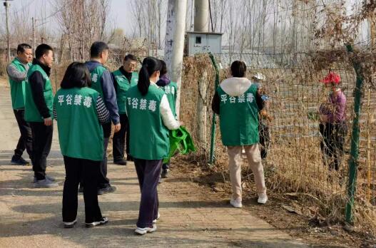 平谷镇综治办工作人员与禁毒志愿者走进西鹿角村种植大棚开展禁种铲毒踏查与宣传活动,深入村民小院、田间地头、偏僻角落、蔬菜大棚、养殖场所等逐一进行踏查,“不漏一户、不放过一株、不留一块死角”。踏查期间, 工作人员还在显眼位置张贴印有罂粟不同生长期的图片、举报电话的宣传海报,向广大群众宣传非法种植毒品原植物的违法性、危害性,呼吁大家积极参与到禁种铲毒工作中来,不种毒、不吸毒,使“种毒违法、种毒必铲、种毒必究”的法治观念更加深入人心。