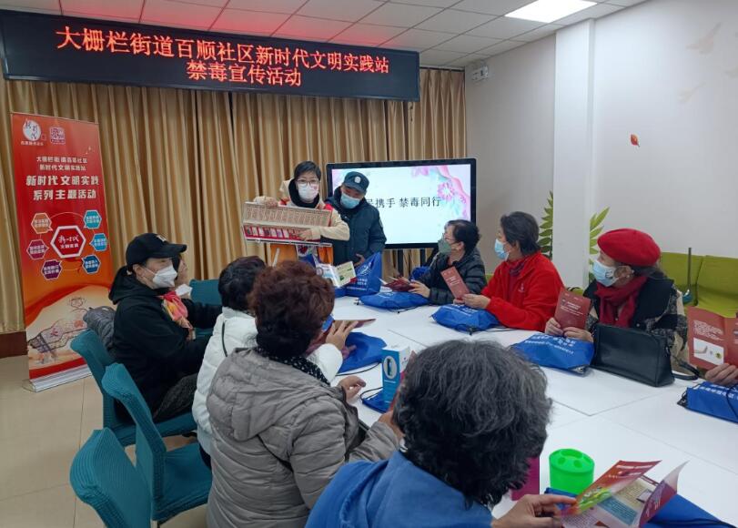 大栅栏街道禁毒工作站联合大栅栏派出所在百顺社区开展“全民携手 禁毒同行”禁毒宣传活动,禁毒专职社工向参加活动的群众、志愿者发放禁毒宣传资料及禁毒宣传品,现场展示仿真毒品模型,并为大家讲解毒品种类及危害等禁毒知识,引导大家积极参加禁毒宣传活动,全民携手,共建无毒社区。