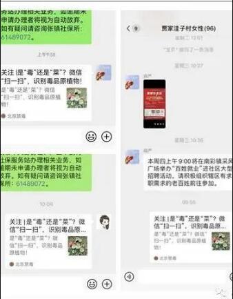 随着经济的发展,越来越多的人使用微信,而北京禁毒微信公众号推出的《是“毒”还是“菜”?微信“扫一扫”,识别毒品原植物!》,为群众介绍了如何借助科技手段来辨识毒品原植物,为此张镇各村居运用微信群积极转发,让更多的群众掌握鉴别毒品原植物的知识。