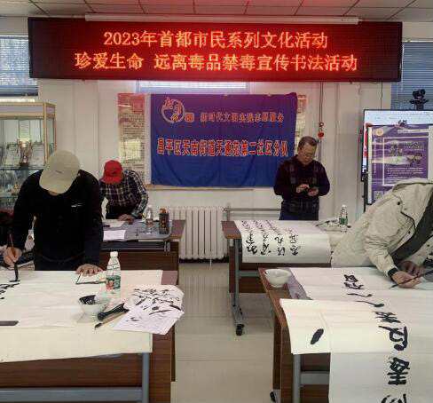 天北街道禁毒工作领导小组办公室联合天南街道走进天通苑二社区开展禁种铲毒宣传活动,社区书法班里的老师们用一幅幅反映禁毒文化的大字表示与毒品作斗争的决心,为建设美好明天、无毒社区奉献自己的力量;禁毒社工向参与活动的居民发放宣传资料,讲解毒品原植物的特征和毒品的危害等知识,呼吁广大群众争当禁毒宣传员,积极参与禁种铲毒工作,营造了浓厚的禁毒氛围。