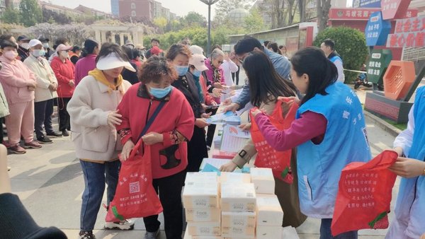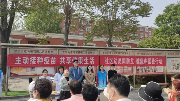 在顺义区马坡二区居民活动广场,医务人员通过设置宣传台,摆放宣传折页、手册,悬挂主题横幅、发放宣传品等形式,将艾滋病性病防治知识、国家“四免一关怀”政策以及反歧视等内容进行现场普及,参与活动的群众领取宣传材料并积极互动提问。
