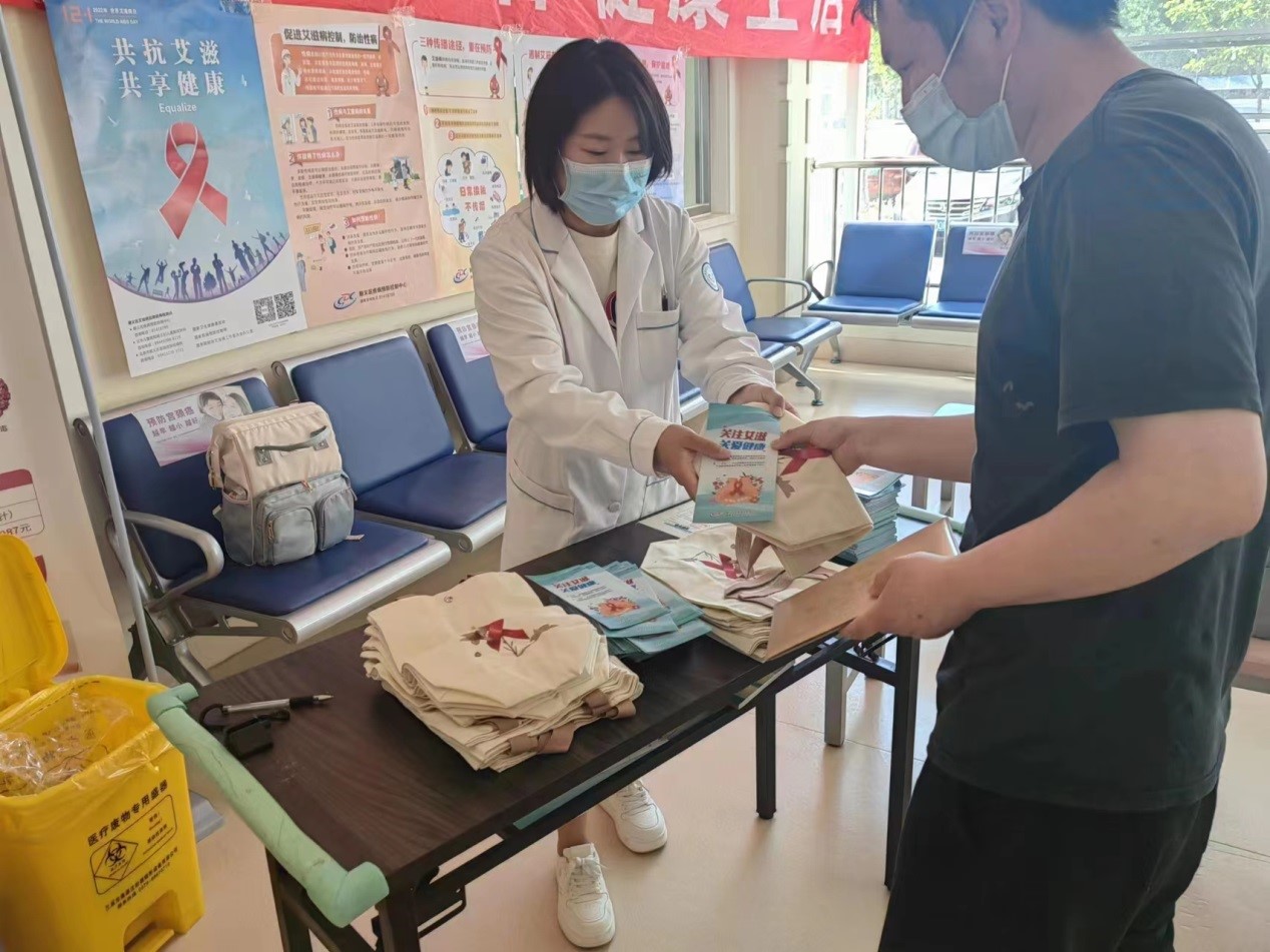 医务人员在候诊大厅通过悬挂海报、设立咨询台、发放宣传材料等多种形式对来往群众进行艾滋病防治知识和国家政策宣传,倡导健康文明的生活方式,反对歧视艾滋病感染者,营造良好社会氛围。活动期间共发放防治艾滋病宣传折页129份。