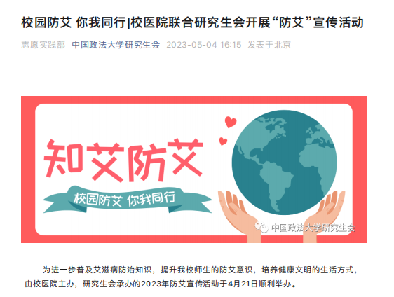 中国政法大学校医院联合研究生会共同开展“防艾”宣传活动,并积极推广e检知防艾小课堂