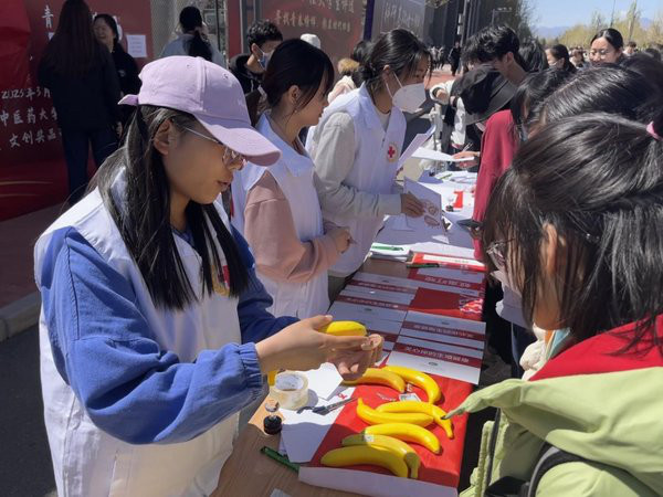 北京中医药大学4月利用世界卫生日契机,积极开展外展防艾宣传活动并宣传e检知(二维码印在香蕉教具上了)