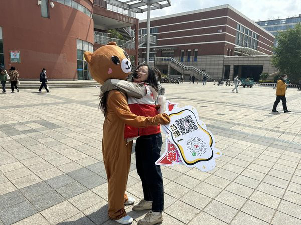 首都经济贸易大学3月校内外展宣传,利用熊玩偶开展爱的拥抱,推广e检知并现场做安全套教学展示。