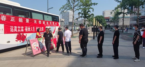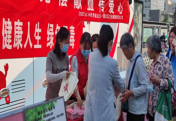 6月14日,依托“世界献血者日”,顺义区疾控中心联合顺义区中心血库在华联商厦西广场献血车旁开展“远离艾滋 健康人生 绿色无毒”禁毒防艾宣传活动。