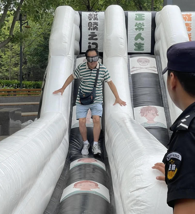更受欢迎的是“禁毒体验”项目,居民群众戴上模拟护目镜,徒步在大型充气滑梯上下走动,模拟体验健康人吸毒后的真切感受。很多居民群众在体验后表示,戴上眼镜走在充气滑梯上,视野变窄、视线模糊不清,感觉晕晕乎乎的,特别是往下走的时候,有种 “踩不到地面”的感觉,吸食毒品对人体的伤害,尤其是不能自主的失控感,实在让人害怕。体验过后,部分居民群众还纷纷来到咨询台前,向工作人员进一步了解毒品的形态、新型毒品的特征等禁毒相关知识,并表示一定要从自身作起,坚决拒绝毒品,还要引导家人和身边的朋友了解毒品的危害等知识,携手远离毒品。