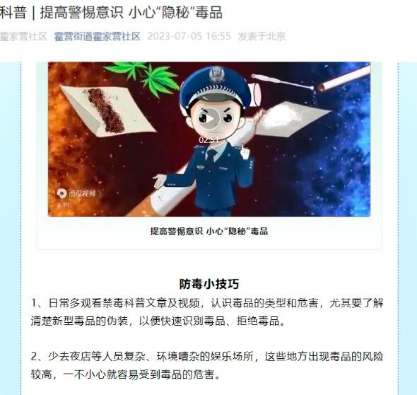 霍营街道霍家营社区组织开展“普及拒毒技巧 抵御毒品侵害”禁毒宣传活动。期间,工作人员在微信公众号、社区APP、微博以及今日头条等线上平台发布《提高警惕意识 小心“隐秘”毒品》的文章,通过视频与图文结合的形式介绍了日常防毒技巧,提醒社区居民一定要保持对毒品的警惕心理,坚决远离毒品。线下方面,工作人员在社区户外电子宣传屏轮播“远离新型毒品 亲近美好人生”等禁毒宣传标语,告诫辖区居民时刻保持拒毒、防毒、禁毒意识,认清吸毒对个人、家庭以及社会造成的严重危害,自觉抵制毒品。同时,工作人员还对居民楼周边绿地以及辖区林地等区域进行细致排查,并积极引导社区群众强化禁种铲毒意识,共同维护和谐无毒家园,全面提升了辖区居民的拒毒意识和能力,形成了共同预防毒品侵害、打击毒品犯罪的良好氛围。