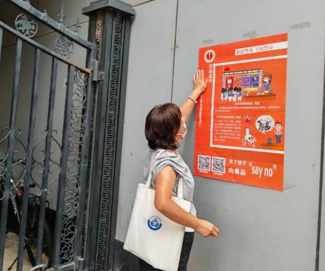 崇外街道禁毒社工在附近的消防通道侧面张贴禁毒宣传海报。活动中,禁毒社工在新景小区通过张贴禁毒海报的方式,向过往居民传递“珍爱生命 拒绝毒品“和“不非法种植毒品原植物”的防毒理念。