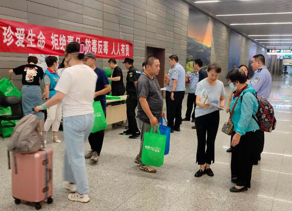 8月11日上午,朝阳区禁毒办、公安分局结合夏季治安宣防和春夏平安行动,联合区交通委、朝阳站管委会、朝阳站内派出所、东风乡、东风派出所等单位,在北京朝阳站开展暑运禁毒预防宣传活动。在现场,以“珍爱生命、拒绝毒品、防毒反毒、人人有责”为主题的禁毒标语,吸引了大量过往游客驻足观看。民警和禁毒专职工作人员为游客解答禁毒方面的问题,指导大家识破新型毒品变换多样的伪装,教育青少年朋友拒绝陌生人提供的食品饮料,提升大家识毒、拒毒、防毒的意识和能力。游客们认真倾听工作人员讲解,详细了解禁毒法律法规和毒品知识,领取禁毒宣传读本,并纷纷表示:毒品害人、害己、害社会,今后要主动抵制毒品,积极参与禁毒斗争,为构建文明和谐的社会环境贡献一份力量。