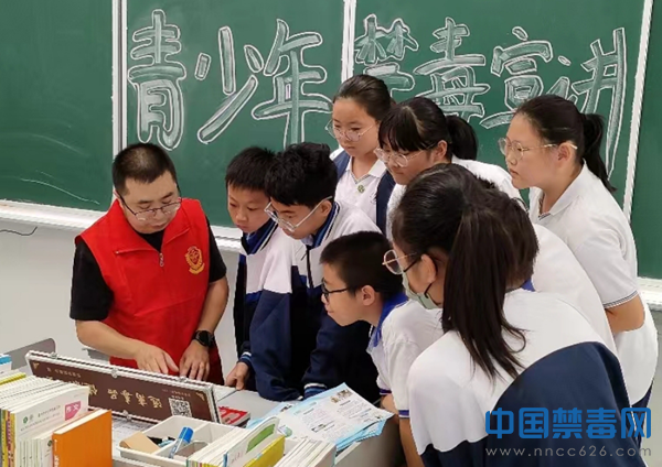 图为禁毒志愿者向学生展示毒品仿真模型。中国禁毒网发