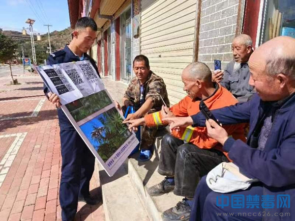 图为工作人员向村民讲解禁毒知识。中国禁毒网发