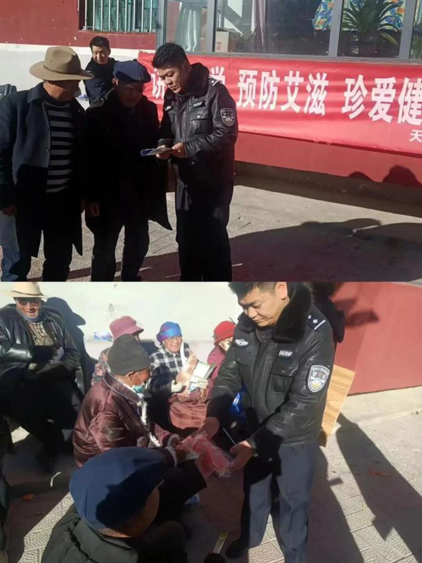 县公安局禁毒大队联合宗加镇、热水乡村委会,共同开展了以“有毒生命无患、无毒健康相伴”为主题的禁毒防艾宣传活动,民辅警、村干部用通俗易懂的表达方式向村民们耐心细致地讲解毒品的危害、艾滋病的传播途径、预防措施等知识,讲明卖淫嫖娼、吸食毒品、非法采血是导致传染艾滋病的主要途径,提醒大家不断提升自我保护意识和防范能力,呼吁大家要带动身边家人做到珍爱生命、远离毒品,预防艾滋、守护健康。