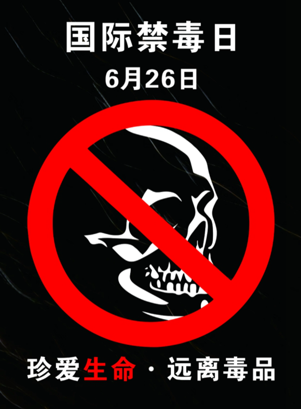 6月26日国际禁毒日宣传海报,整个海报画风以黑和红为主基调,带给观众强烈的视觉冲击,警示人们毒品能带来严重的危害。