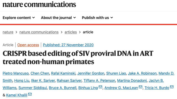 2020年11月,美国天普大学和内布拉斯加大学医学中心的研究人员在 Nature Communications 期刊上发表研究论文。成功地在非人灵长类动物的基因组中编辑并清除了与HIV密切相关的SIV-a病毒,这在艾滋病研究中迈出了重要一步。这一突破也使得人类比以往任何时候都更接近于开发出彻底治愈艾滋病的方法。