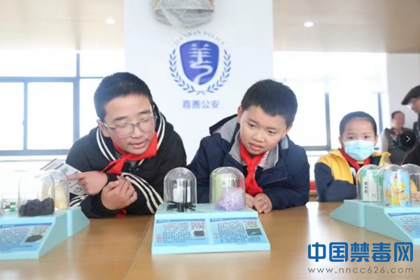 随后,民警带领学生来到了活动室,现场展出的各类毒品仿真模型立即引起了学生的浓厚兴趣,通过这样近距离的观察,使学生对毒品的外观和特征有了更清晰的了解。
