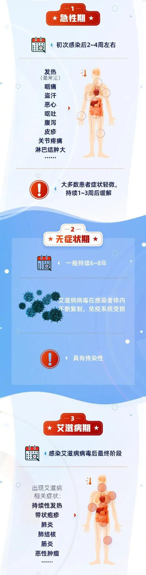 从感染艾滋病病毒到发展成艾滋病患者,可分为三个时期: