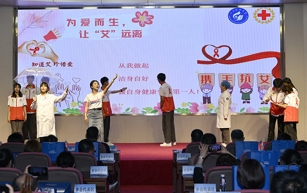会前,全体参会人员共同观摩了我校“杜杜守护青春”防艾游园会活动,欣赏了我校学生自编自演的山东快书《预防艾滋莫等闲》、情景剧《铮铮铁骨 闻鸡起舞》。(记者:许浩 通讯员:刘慧宁 责编:任波)