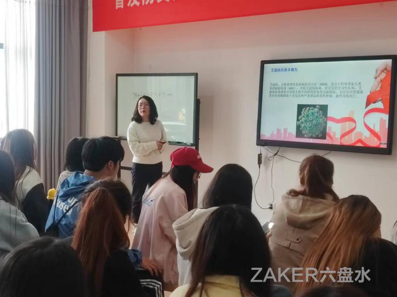 " 艾滋病的传播途径有三种,分别为性传播、血液传播、母婴传播。青年学生是艾滋病防治的重点人群,青年学生预防艾滋病要牢记‘三要’‘三避免’ ……" 活动中,水城区疾控中心副主任张小金首先通过讲座的方式,向学生讲授了 " 红丝带的含义 "" 关于艾滋病你知道多少 "" 艾滋病的传播途径 "" 感染艾滋病的症状 ""HIV 暴露后预防 " 等内容。