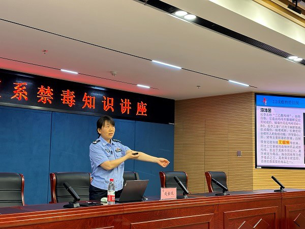 活动邀请到北京市天堂河女子强制隔离戒毒所教育矫正中心赵金凤副主任,赵老师以“青春无悔 人生无憾”为题,向学生们介绍了目前北京市的毒情形势,毒品的起源,毒品的概念及分类,分别讲述了不同性状的毒品会带来什么样的危害,强调现在新型毒品层出不穷,并通过大量的图片、视频及真实案例说明青少年群体是重点关注人群,希望引起学生们的重视。