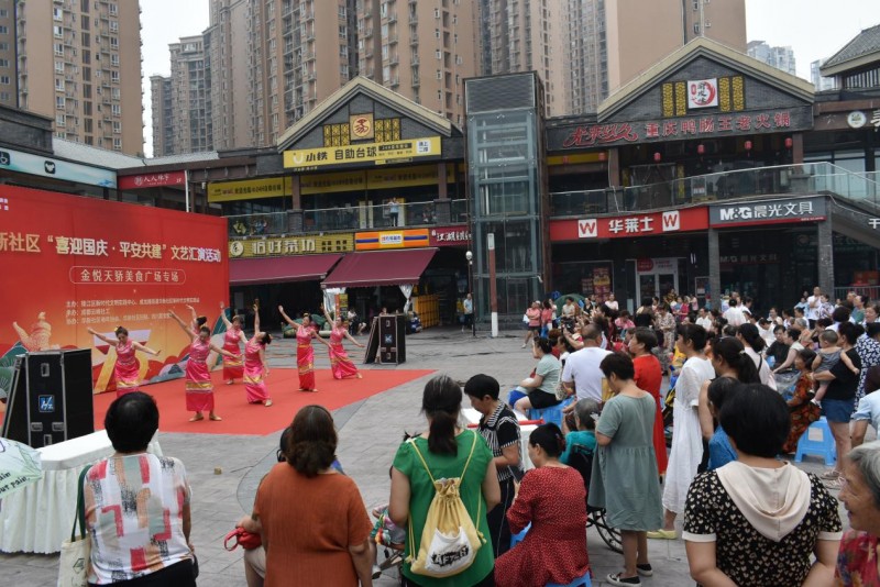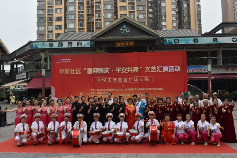 活动分别在华新社区金悦天骄美食广场、首创娇子1号小区、华新美庐小区进行,傣族舞《月光下的凤尾竹》、瑜伽《苹果香》、走秀《一湖清水》、戏曲《我把美酒献给你》、舞蹈《相逢是首歌》、蒙古舞《山顶》等节目轮番上演,为辖区居民带来了一场文化盛宴,居民以歌寄情、以舞为媒,用饱满的热情、动听的旋律、优美的舞蹈展现居民爱党、爱国、爱社区、爱生活的热情,传递爱国情怀,表达着对祖国的祝福,共同祝愿伟大祖国繁荣富强。