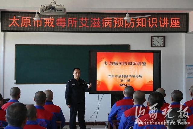 太原市强制隔离戒毒所利用各大队教育基础日,在属地疾控中心指导下,组织卫生所医师为戒毒人员开展艾滋病预防知识专题讲座,深入讲解艾滋病的特点、传播途径和预防措施等知识,重点讲解了吸毒与艾滋病的关系等,提醒戒毒人员一定要提高警惕、洁身自好。