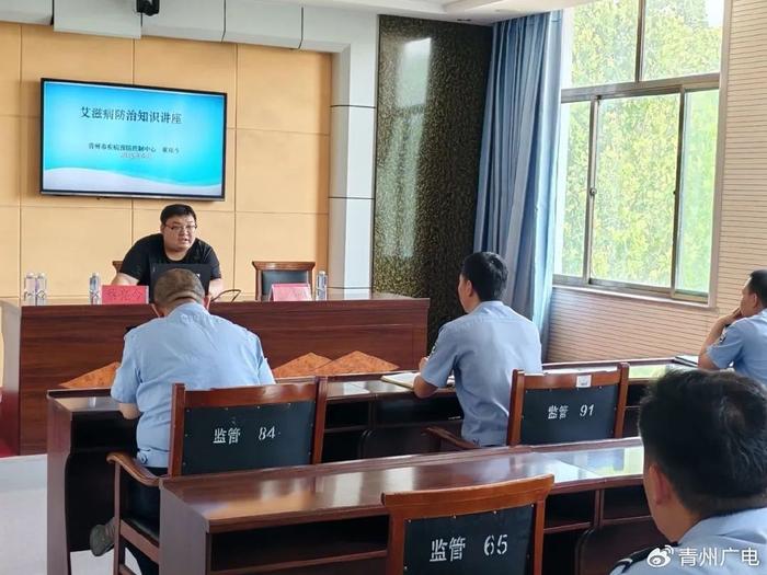 6月6日上午,青州市疾控中心工作人员到青州市看守所开展艾滋病和结核病防治知识讲座,中心相关科室人员对看守所全体民警辅警从艾滋病和结核病传播途径、预防措施及职业暴露后的预防性用药等几个方面进行了系统的讲解,与公安干警面对面的进行交流和讨论在工作中遇到的各种特殊情况的处理,看守所大队班子成员、办公室工作人员及管教民警参加了本次培训。