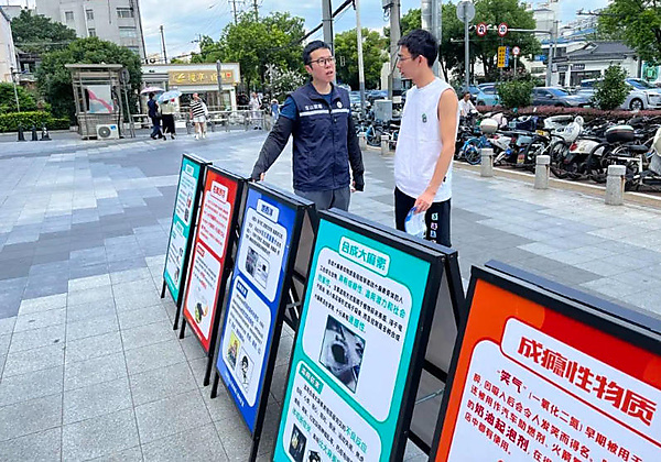 禁毒社工们还向路过的骑手小哥、就餐食客、附近商铺工作人员发放禁毒宣传手册,特别对路过的暑假中小学生叮嘱,呼吁大家一起抵制毒品危害。