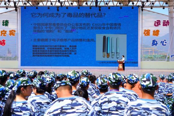 活动中,禁毒民警用PPT向学生们介绍了毒品的种类、特征、危害、来源、传播途径、预防方式,以及禁毒法律法规、禁毒政策和禁毒知识,从传统的海洛因、冰毒,到伪装成“跳跳糖”“电子烟”的新型毒品,深入浅出地揭示了毒品的隐蔽性和诱惑力。
