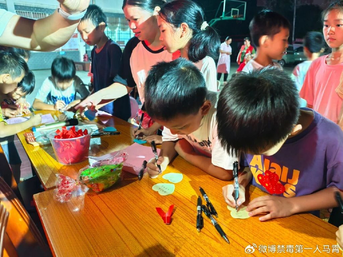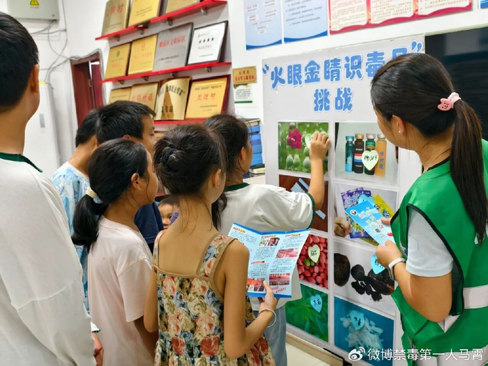 “火眼金睛识毒品”挑战环节更是精彩纷呈。小朋友们围在毒品识别展板前,仔细辨认罂粟、大麻等毒品图片,在禁毒社工的引导下准确说出毒品名称。“罂粟花虽然很漂亮,但一株都不能种,种了犯法!”社工的讲解让孩子们牢记法律底线与识别技巧。现场一位村民感慨道:“以前不知道毒品能伪装成零食,以后一定要多提醒孩子!”