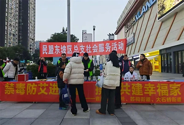 12月4日,民盟东坡区总支联合省眉山强戒所、东坡区苏祠街道和大石桥街道,在万达广场开展了一场以“禁毒防艾进万家 携手共建幸福家”为主题的宣传活动。