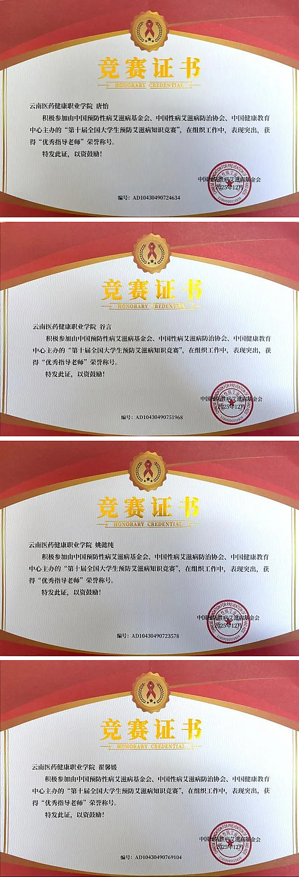 近日,由中国预防性病艾滋病基金会等权威机构联合主办的“2025年第十届全国大学生预防艾滋病知识竞赛”圆满落幕。云南医药健康职业学院心理健康教育中心(以下简称“中心”)广泛动员学生积极参与,荣获“优秀组织单位”称号,中心唐怡、谷言、姚懿纯、翟馨媛四位教师获评“优秀指导老师”。这项成绩充分展现了学校在艾滋病预防宣传教育方面的扎实成效与积极影响力。